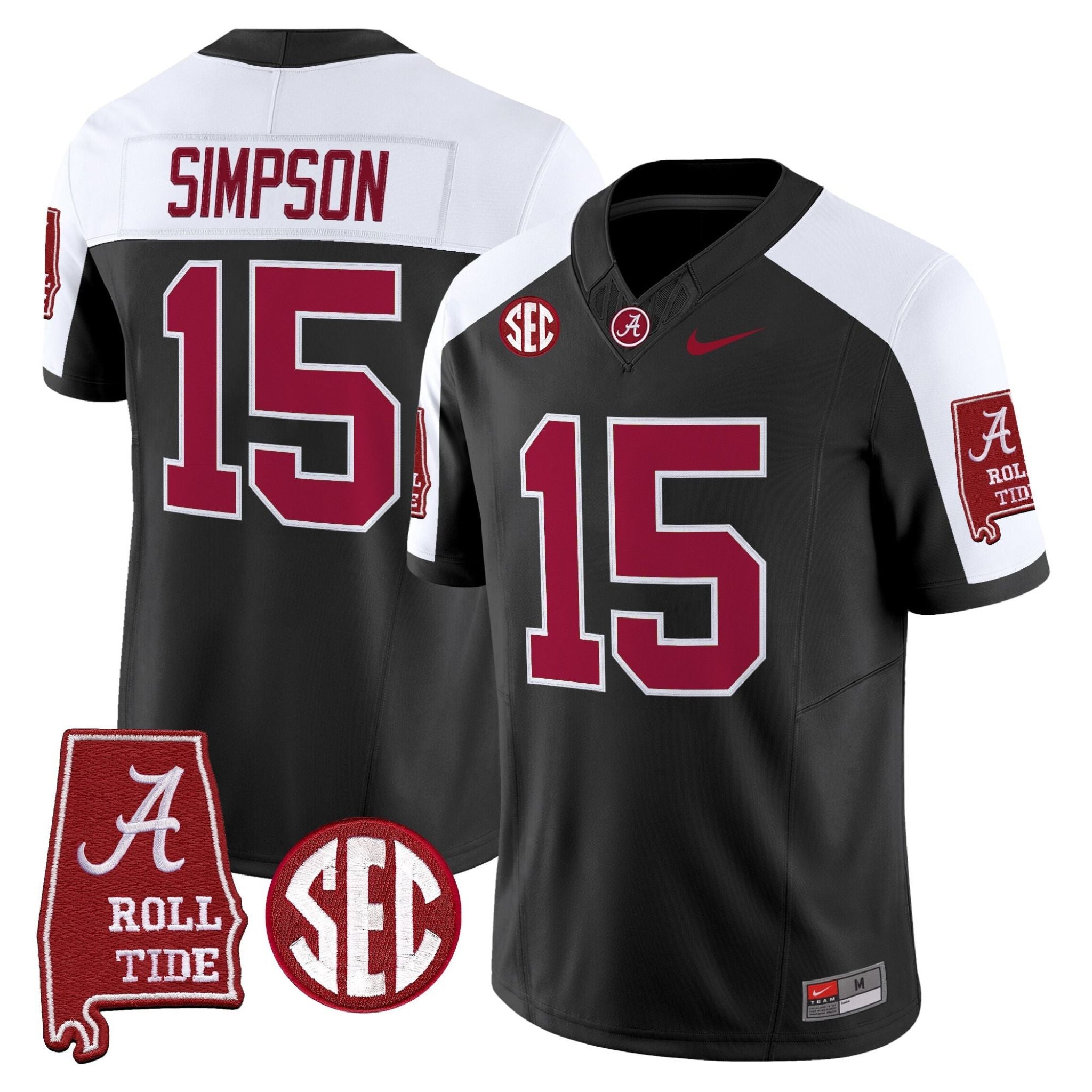 A. Crimson Tide #15 Ty Simpson 2025 Roll Tide & Sec Patch Fan Jersey - Black Alternate