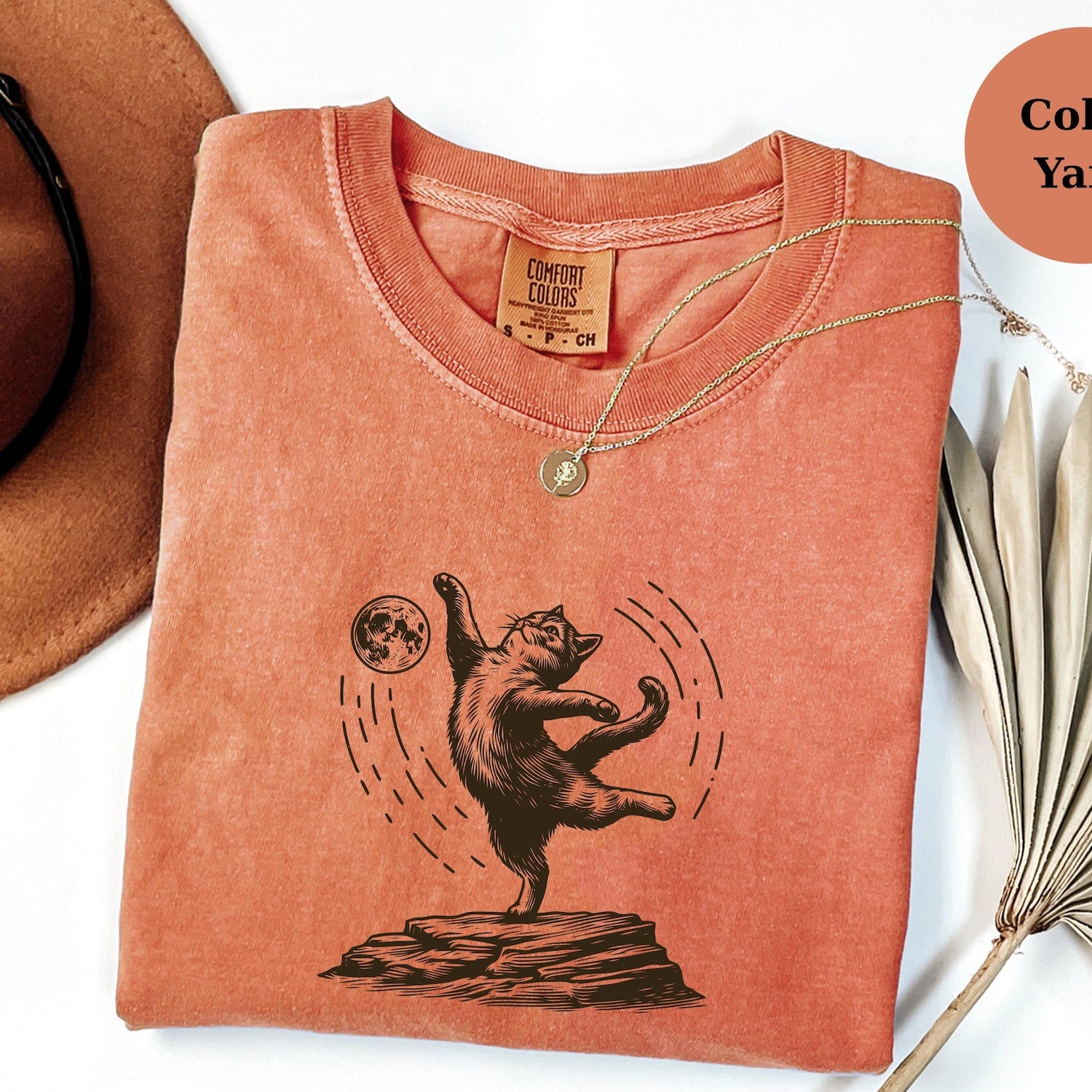 Cat Dancing Shirt, Moon Cat Tee, Cosmic Cat Art Top, Funny Cat Lover Gift, Boho Cat Graphic Tee, Retro Cat Shirt Unisex