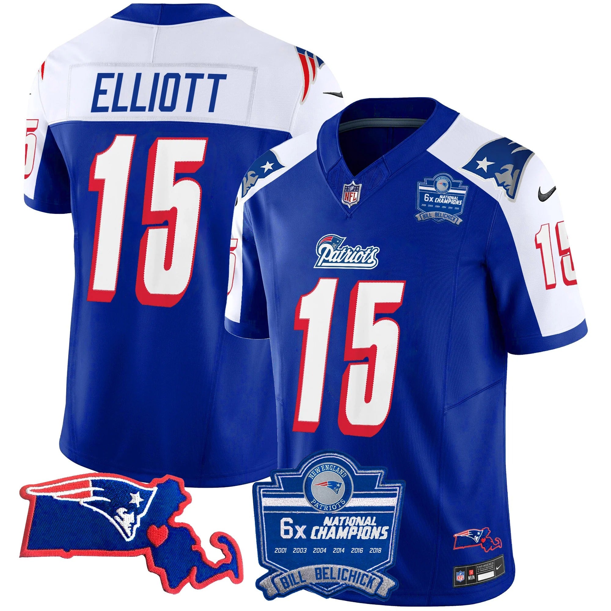 N.E Patriots #15 Ezekiel Elliott Bill Belichick 6x Champions & State Patch Fan Jersey - 1996 Alternate